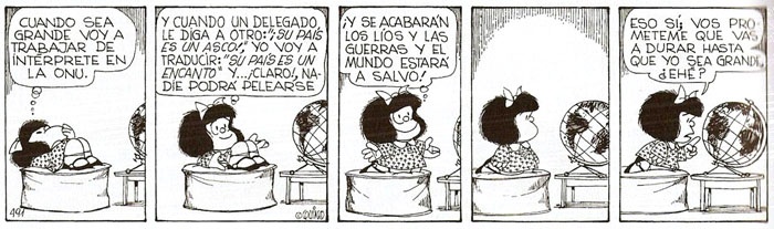 La Mafalda volia que el món fos millor del que era quan va néixer (1964) i per això s’imaginava mil maneres de canviar-lo, com ara ser intèrpret de l’ONU per fer que els que manaven es diguessin coses boniques en lloc de barallar-se.